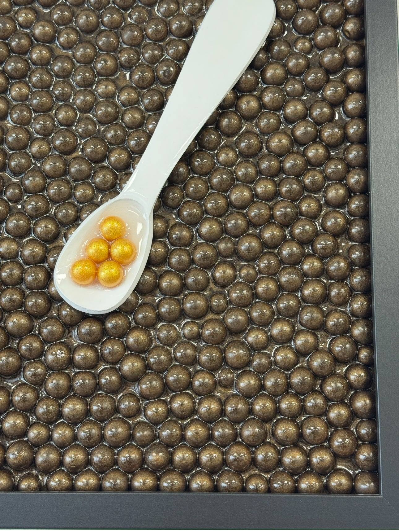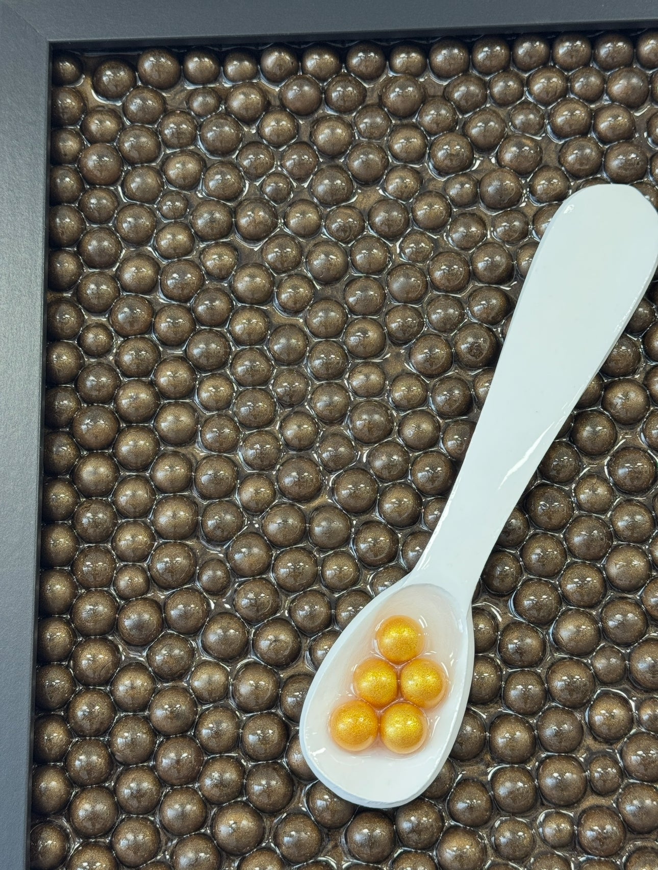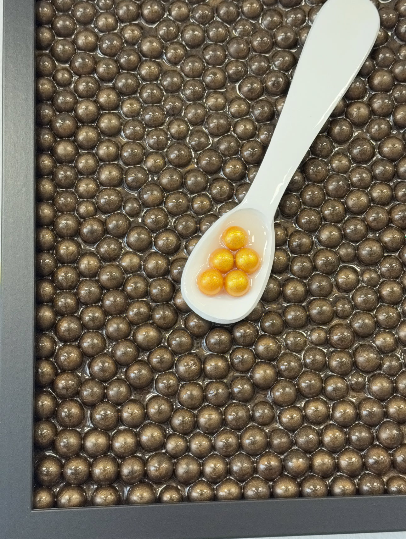 This unique caviar inspired artwork blends modern luxury with playful creativity. The piece features a sleek, refined frame filled with 380 bronze colored caviar pearls that together create a rich, textured background. At the center lies an elegant pearl spoon filled with gold colored pearls symbolizing caviar. The strong contrast between the iridescent spoon and the dark pearl structure creates a striking 3D effect that immediately captures attention.