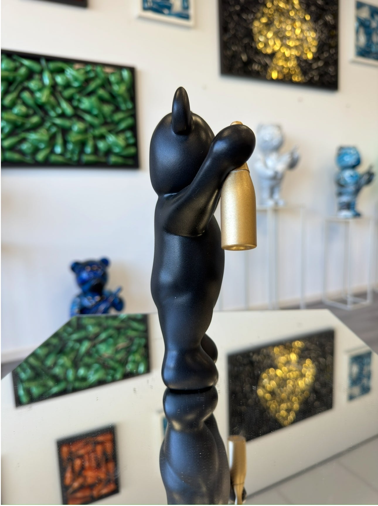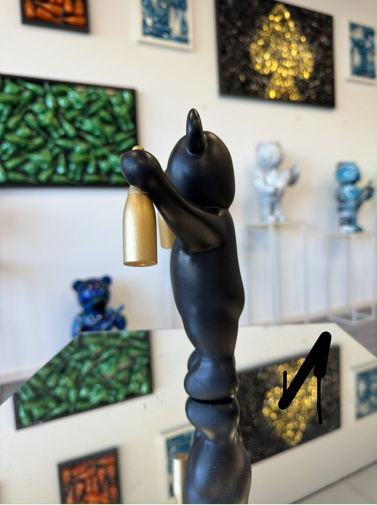 - The figurine depicts a black bear with a bold, fierce expression, conveying a sense of assertiveness and character. The bear holds a gold-colored Ice Bucket with Golden bottles of champagne, adding a luxurious touch and playful twist to the design.