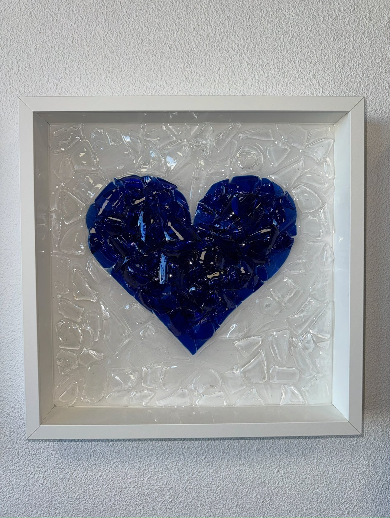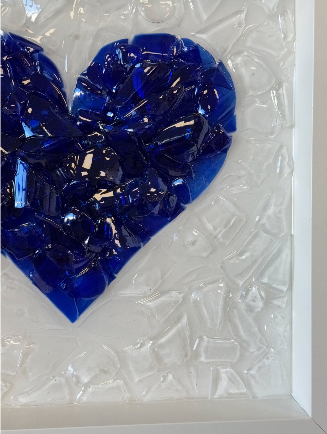 This artwork features a heart formed from deep blue glass shards, surrounded by clear, transparent fragments. The composition is carefully arranged within a white frame, allowing the intense color of the heart to stand out. The contrast between the deep blue and the translucent glass symbolizes both strength and vulnerability, a visual metaphor for human emotion.