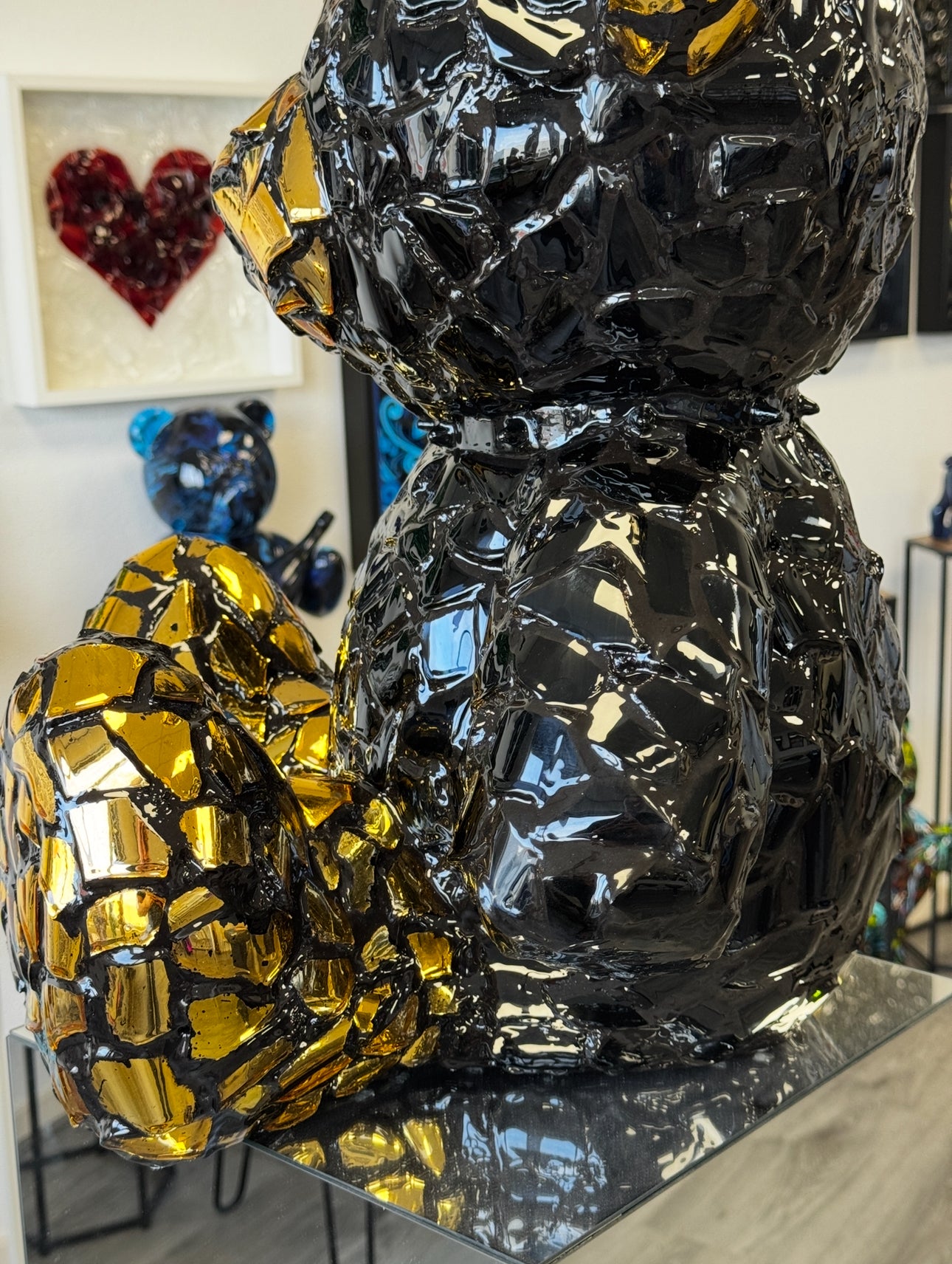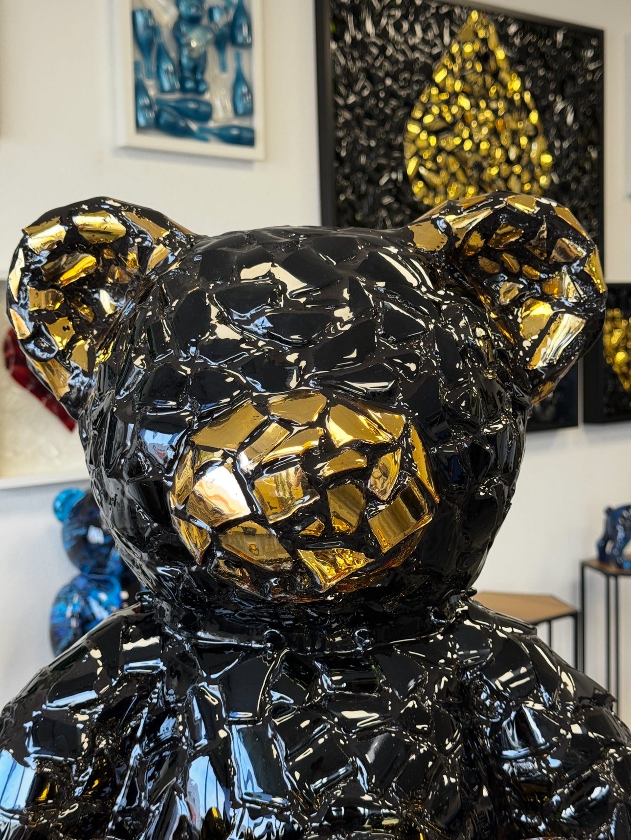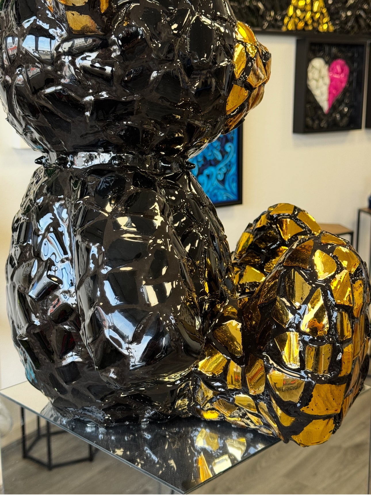 Bear Crack is a modern and striking artwork in the shape of a teddy bear, crafted from a mosaic of glossy black and gold elements. This sculpture combines luxurious materials with a unique cracked structure that immediately draws attention. The reflective gold fragments create a dynamic play of light, giving the artwork a different appearance from every angle.