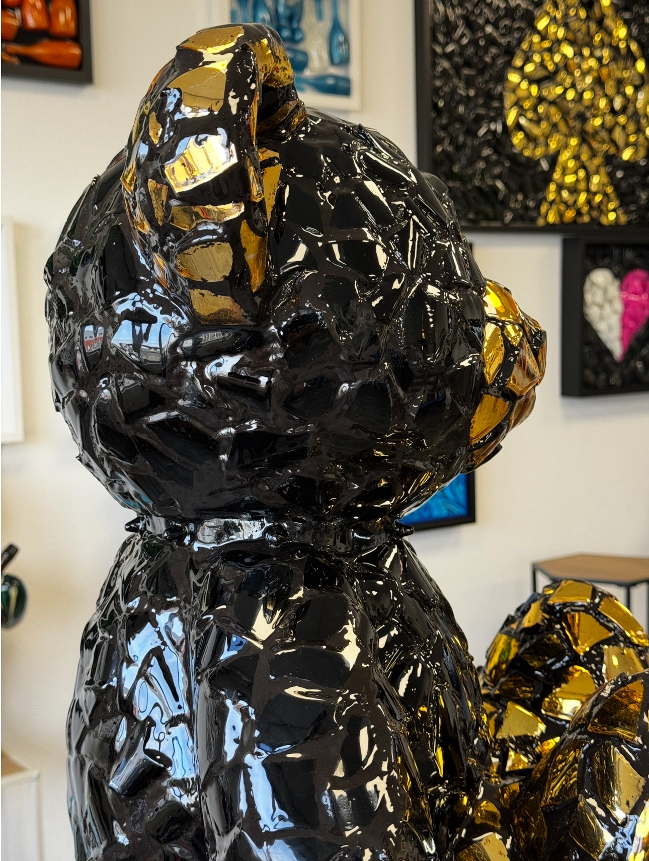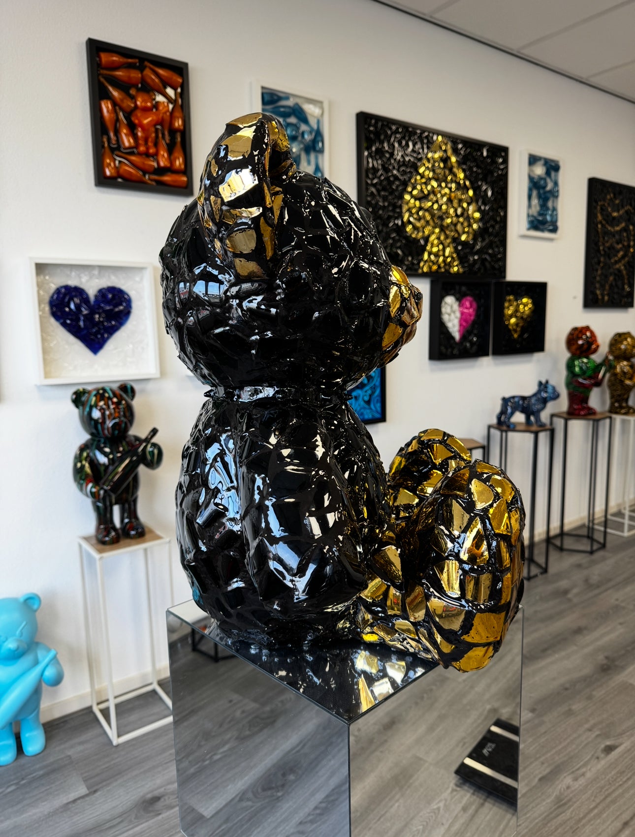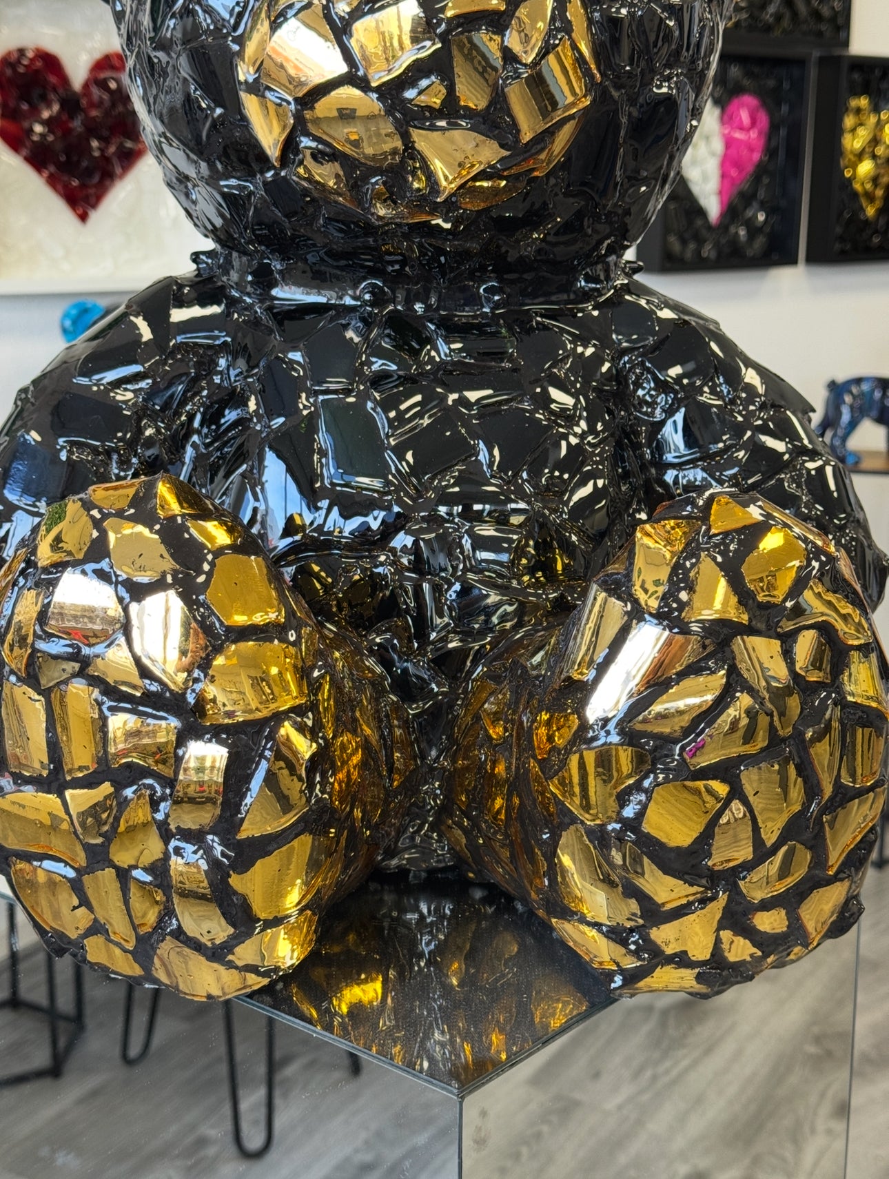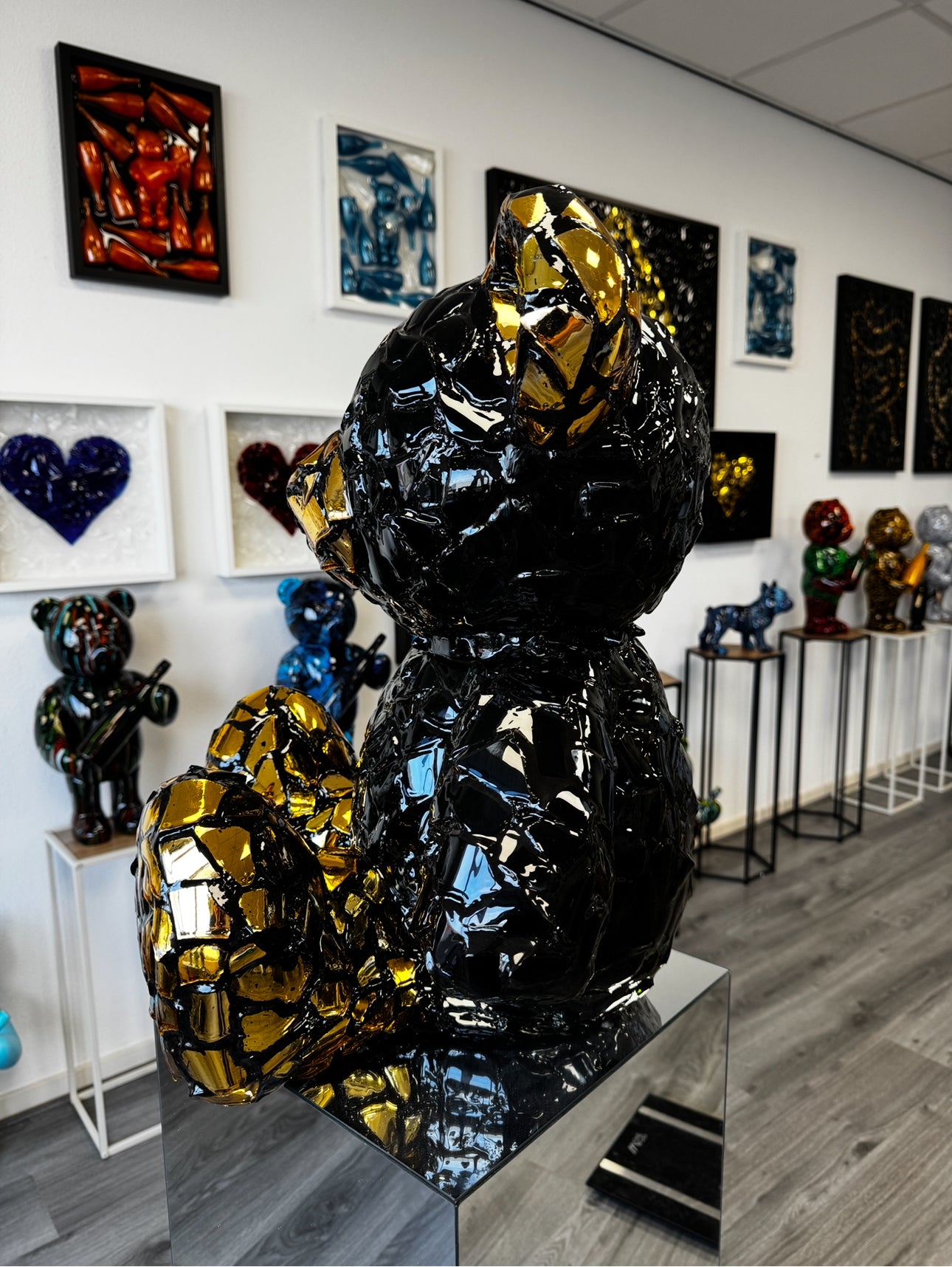 Bear Crack is a modern and striking artwork in the shape of a teddy bear, crafted from a mosaic of glossy black and gold elements. This sculpture combines luxurious materials with a unique cracked structure that immediately draws attention. The reflective gold fragments create a dynamic play of light, giving the artwork a different appearance from every angle.