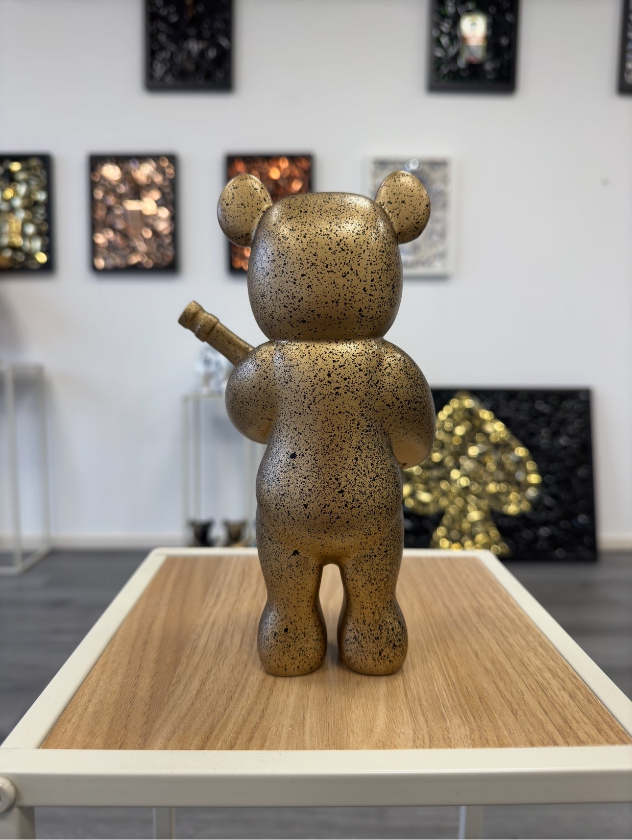 The figurine depicts a Gold with black specks with a bold, fierce expression, conveying a sense of assertiveness and character. The bear holds a Gold-colored bottle, adding a luxurious touch and playful twist to the design.