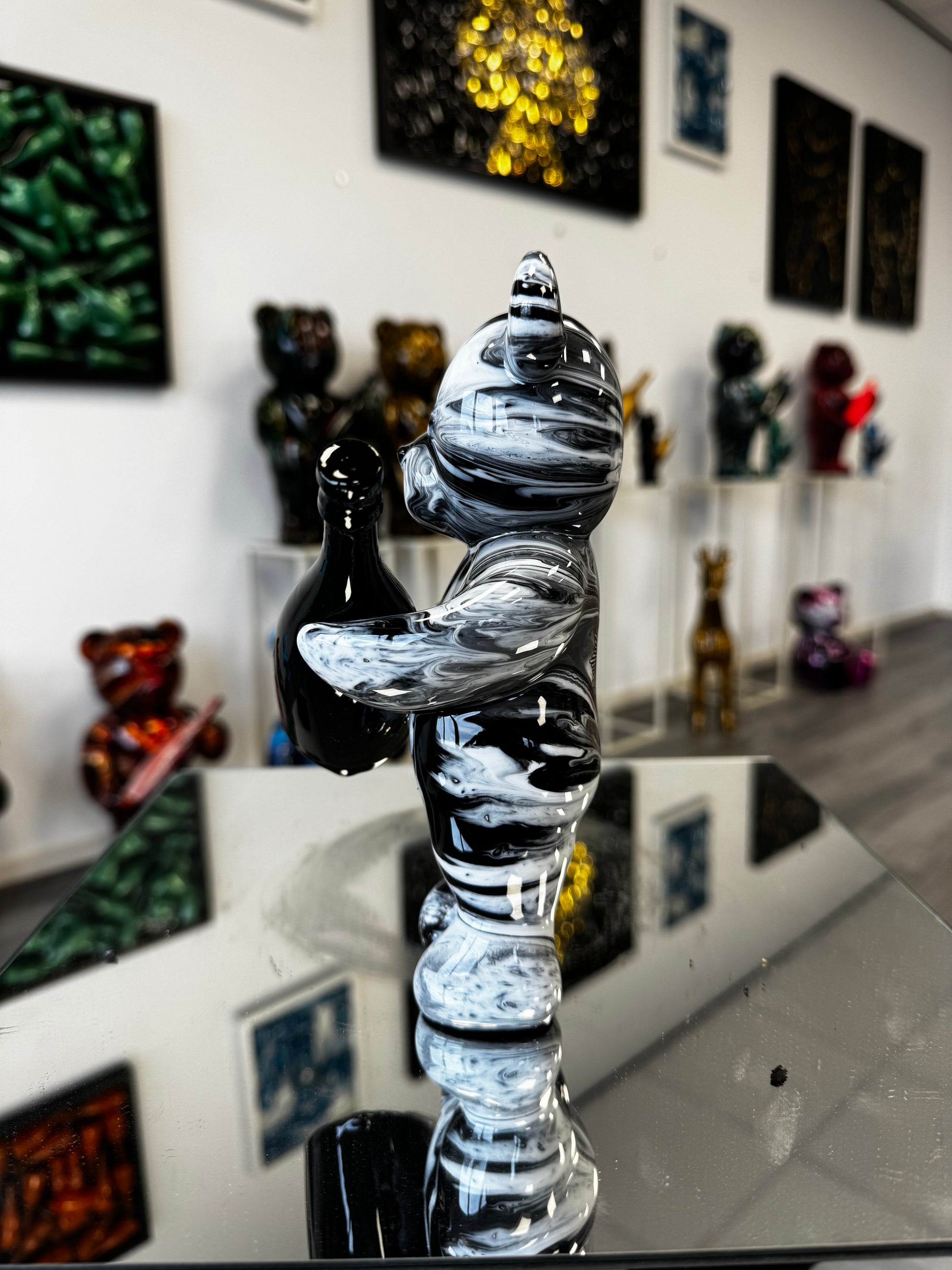 - The figurine depicts a bear with a black/white paint job witch a bold, fierce expression, conveying a sense of assertiveness and character. The bear holds a Black colored bottle, adding a luxurious touch and twist to the design.