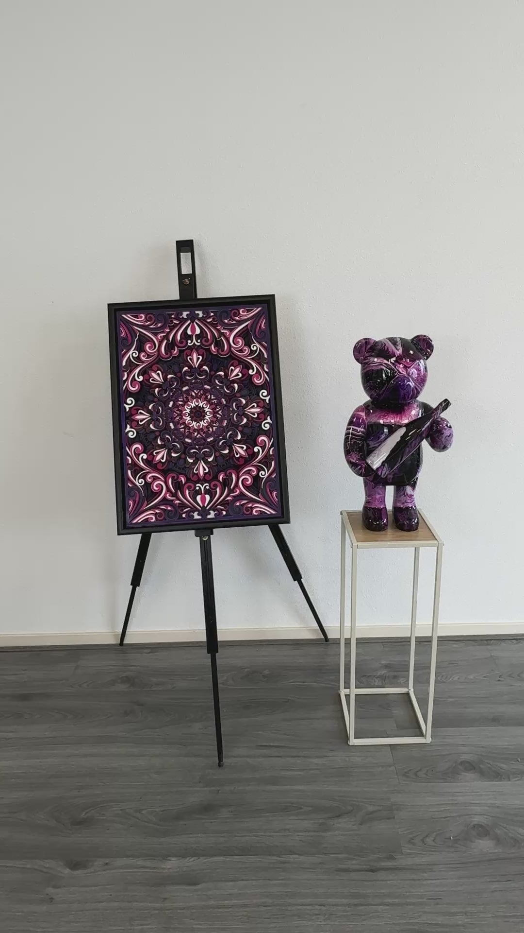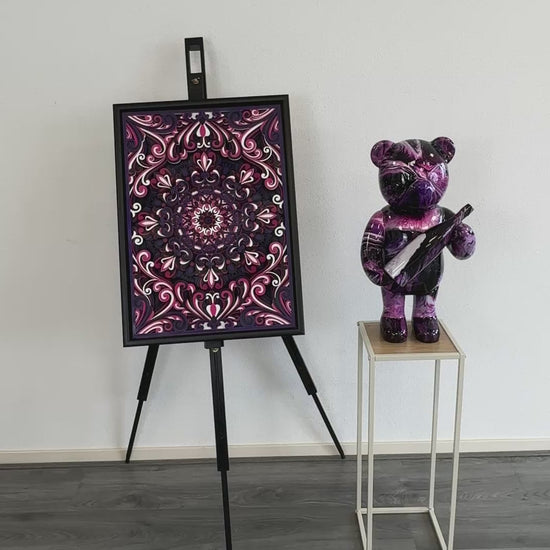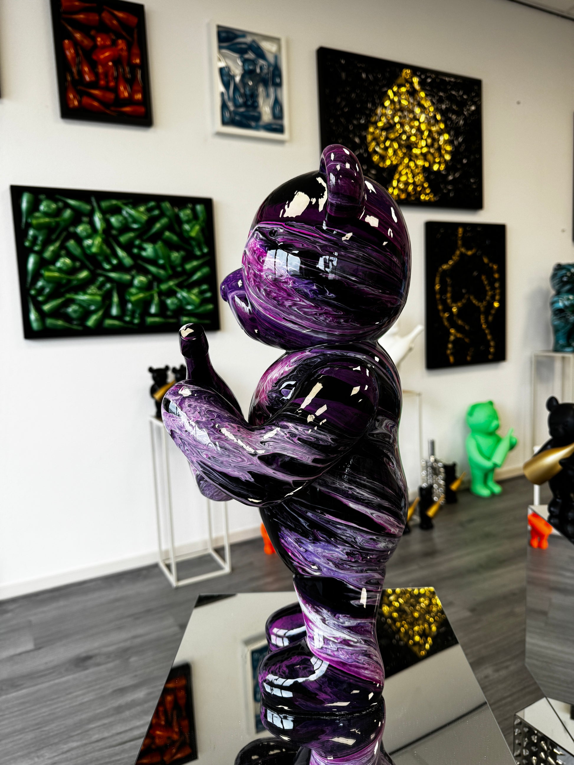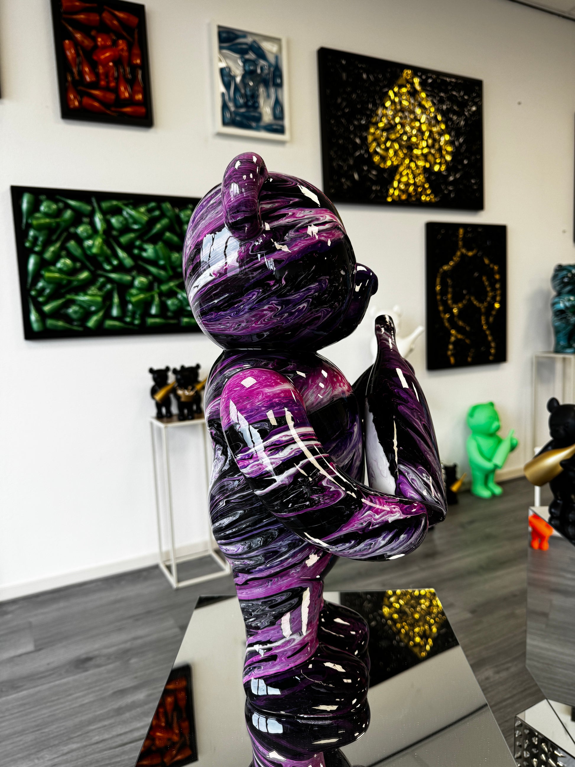 - The figurine depicts a bear with a Galaxy paint job witch a bold, fierce expression, conveying a sense of assertiveness and character. The bear holds a Galaxy -colored bottle, adding a luxurious touch and twist to the design.