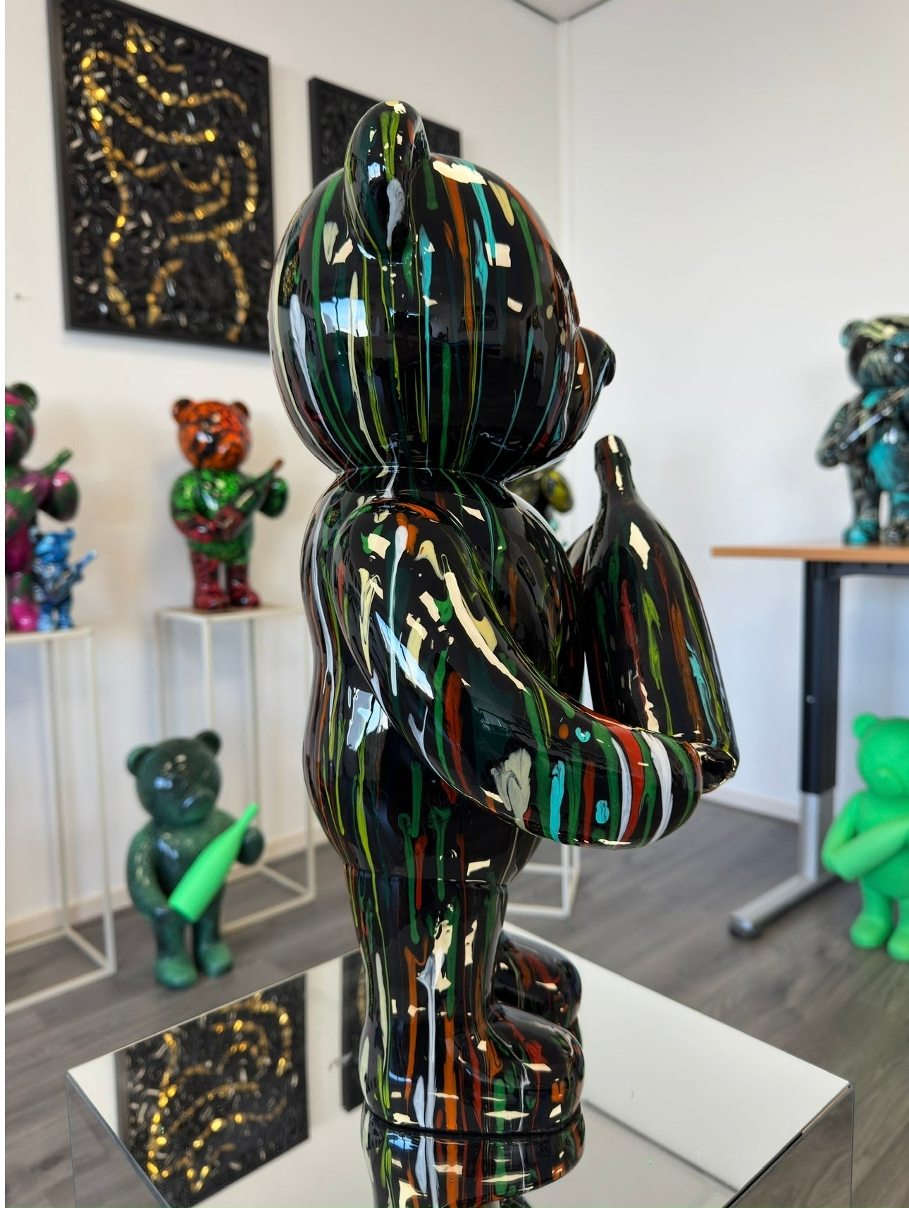 - The figurine depicts a bear with a multi colored paint job witch a bold, fierce expression, conveying a sense of assertiveness and character. The bear holds a multi colored bottle, adding a luxurious touch and twist to the design.