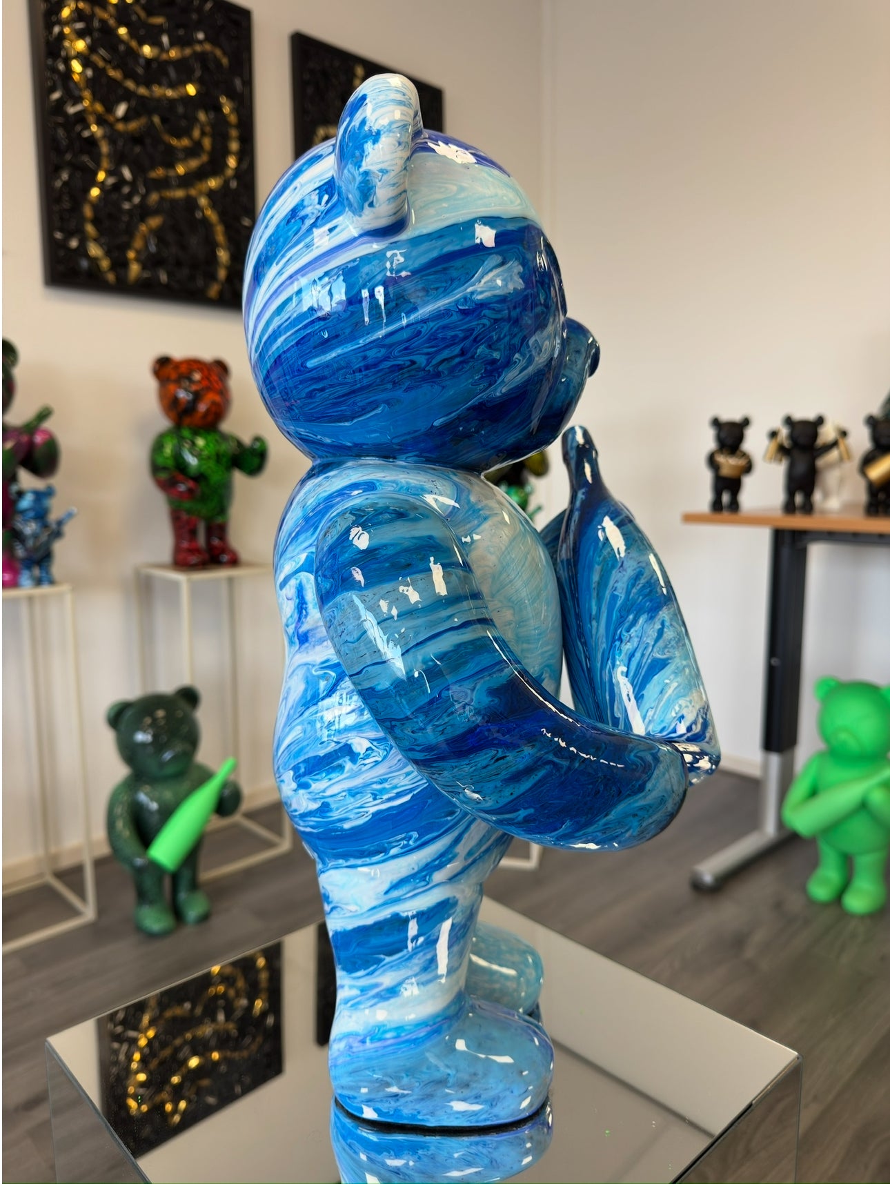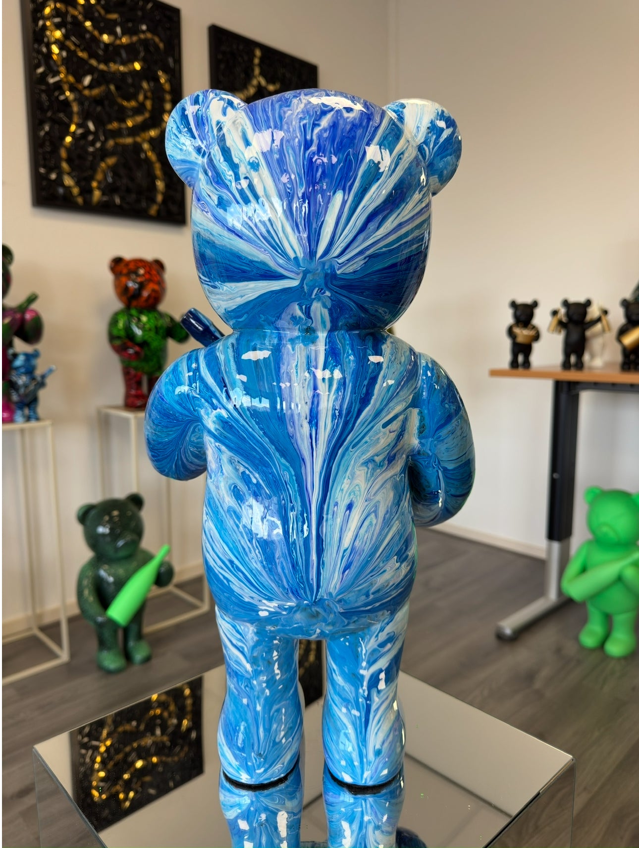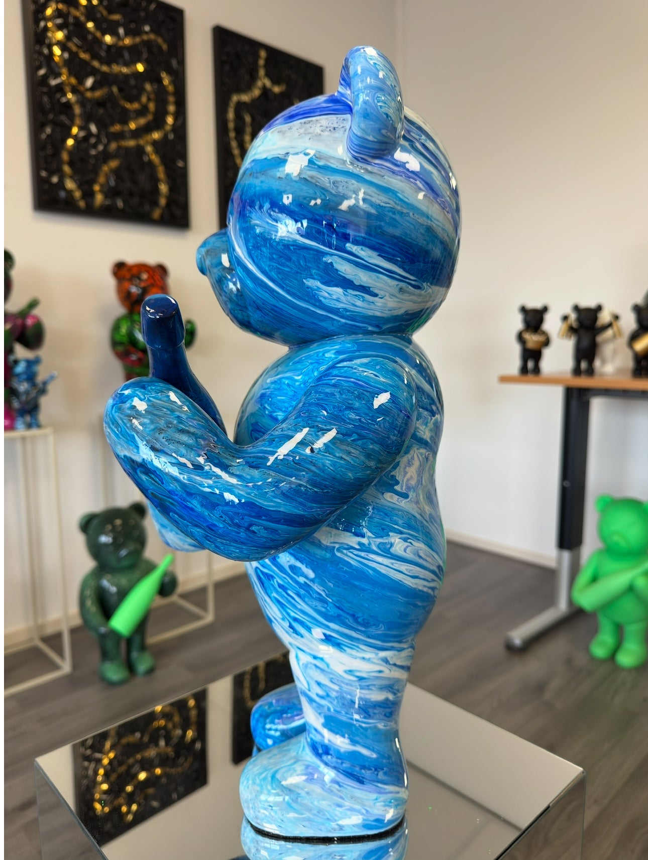 - The figurine depicts a bear with a Blue paint job witch a bold, fierce expression, conveying a sense of assertiveness and character. The bear holds a Blue colored bottle, adding a luxurious touch and twist to the design.