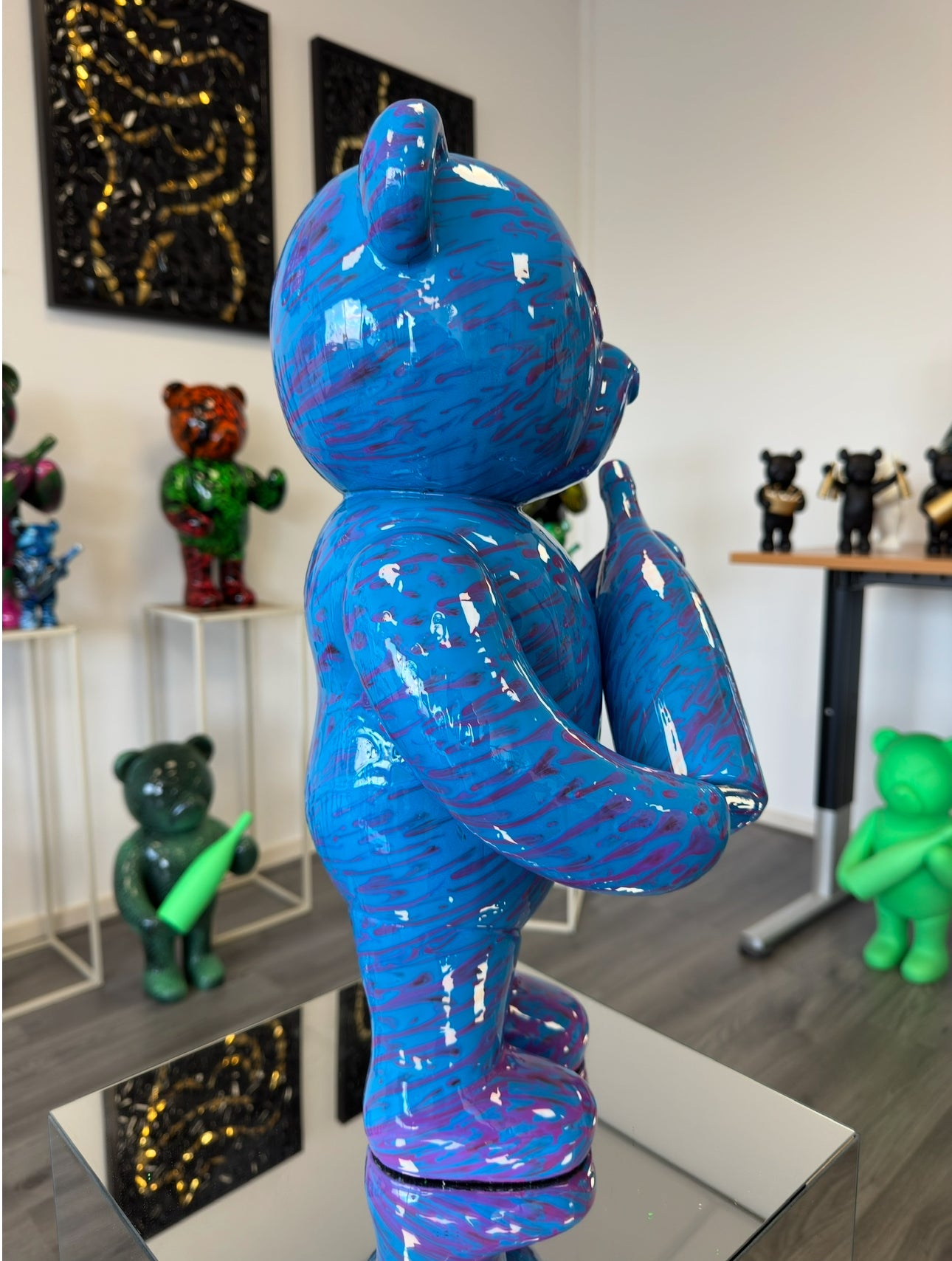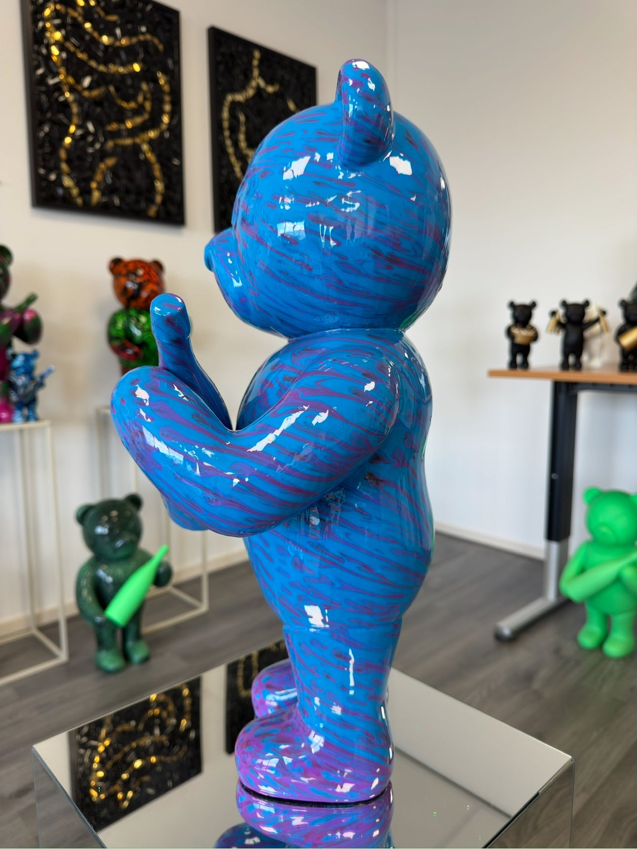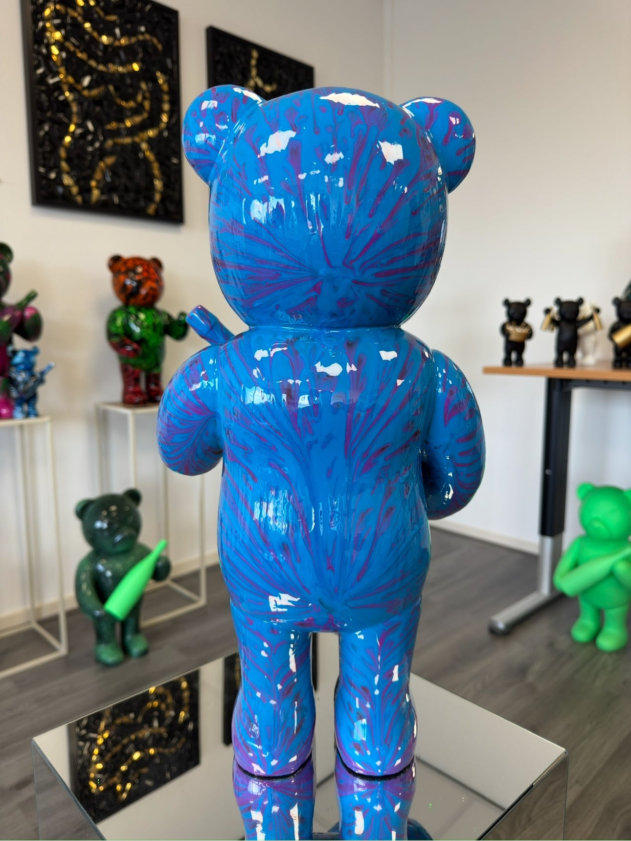 - The figurine depicts a bear with a Blue and Pink paint job witch a bold, fierce expression, conveying a sense of assertiveness and character. The bear holds a Blue and Pink colored bottle, adding a luxurious touch and twist to the design.